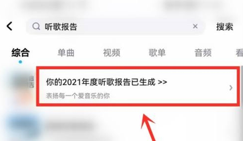 小伙伴们需要拥有酷狗音乐APP最新版,打开软件在搜索栏的位置搜索听歌报告,会跳出下拉“你的2021年度听歌报告已生成”点击进入。