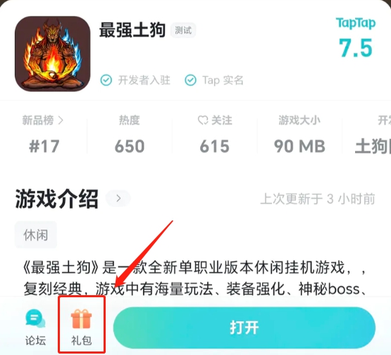 角色扮演最强土狗是一款挂机类型的休仙游戏,这款游戏中玩家可以通过兑换码获得非常多的奖励,兑换码在玩家进入游戏前,在taptap界面的左下角选择礼包进行领取,即可获得兑换码。