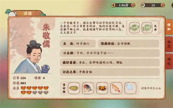 角色扮演朱敬儒是桃源深处有人家这款游戏中的一个NPC,他是一个居民,想必很多的玩家都很好奇这名NPC的喜好吧?下面的文章中有他喜欢的菜品和鱼,并且有着获得的配方和获取方式。
