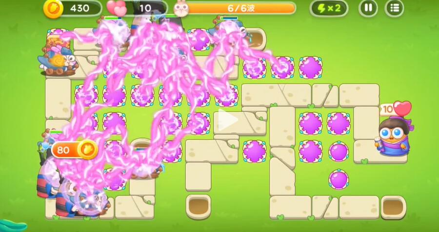 4、敌人会分两拨攻击,所以在两边都要放一些满级的炮塔。